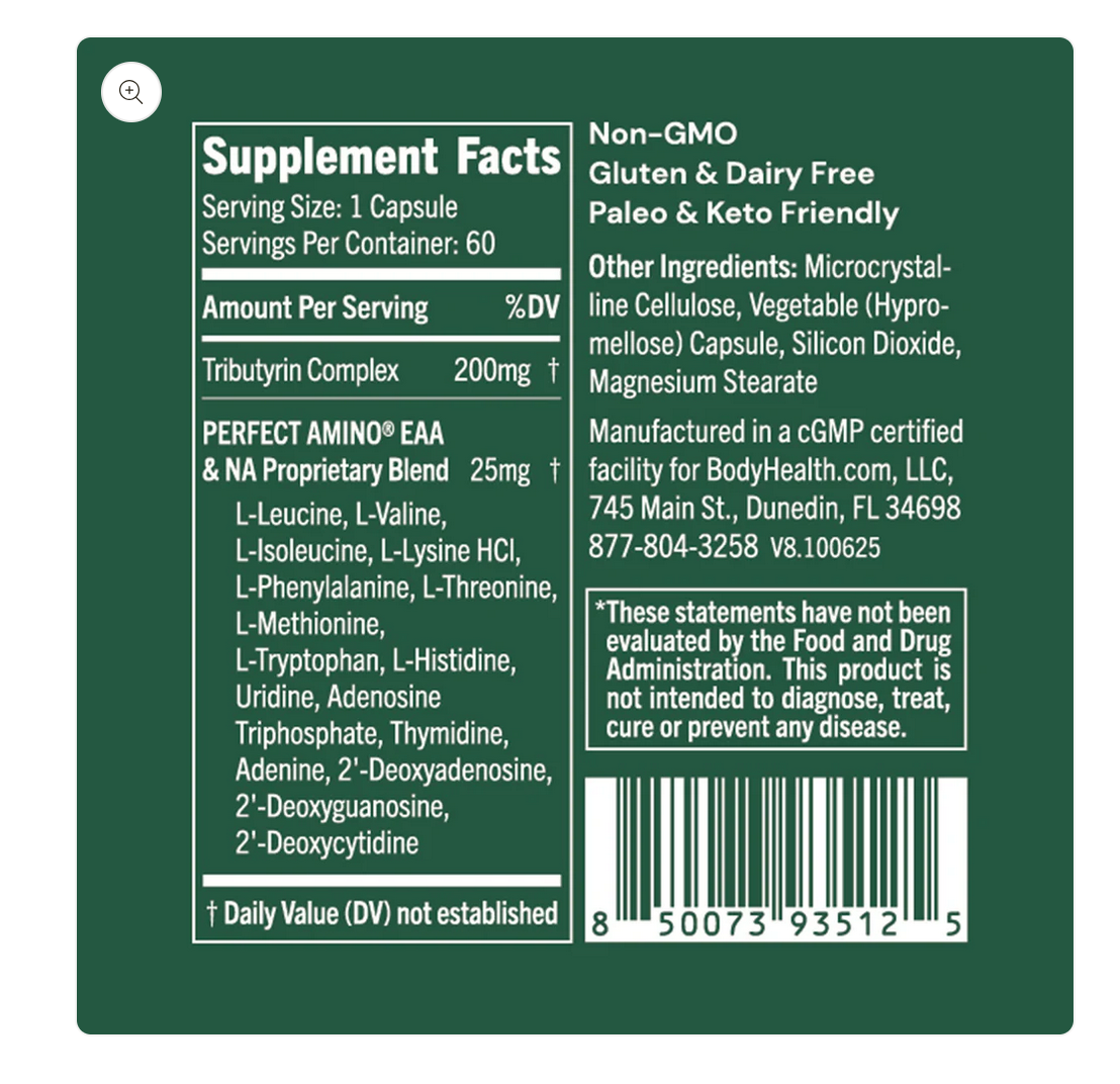 Each capsule provides 200 mg Tributyrin Complex plus PerfectAmino® Essential Amino Acids.*